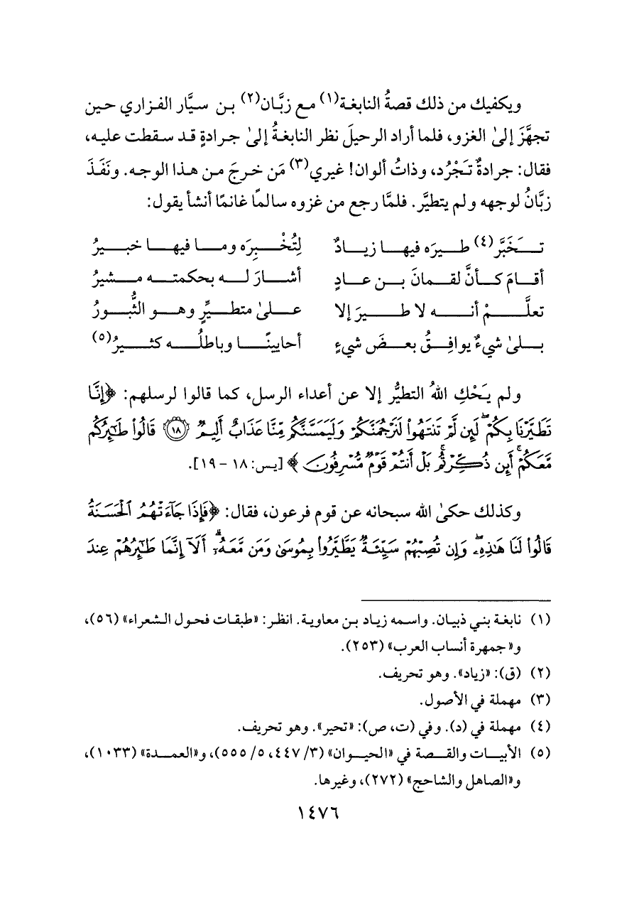 ويكفيك من ذلك قصةُ النابغة (¬١) مع زبَّان (¬٢) بن سيَّار الفزاري حين تجهَّزَ إلى الغزو، فلما أراد الرحيلَ نظر النابغةُ إلى جرادةٍ قد سقطت عليه، فقال: جرادةٌ تَجْرُد، وذاتُ ألوان! غيري (¬٣) مَن خرجَ من هذا الوجه. ونَفَذَ زبَّانُ لوجهه ولم يتطيَّر. فلمَّا رجع من غزوه سالمًا غانمًا أنشأ يقول: