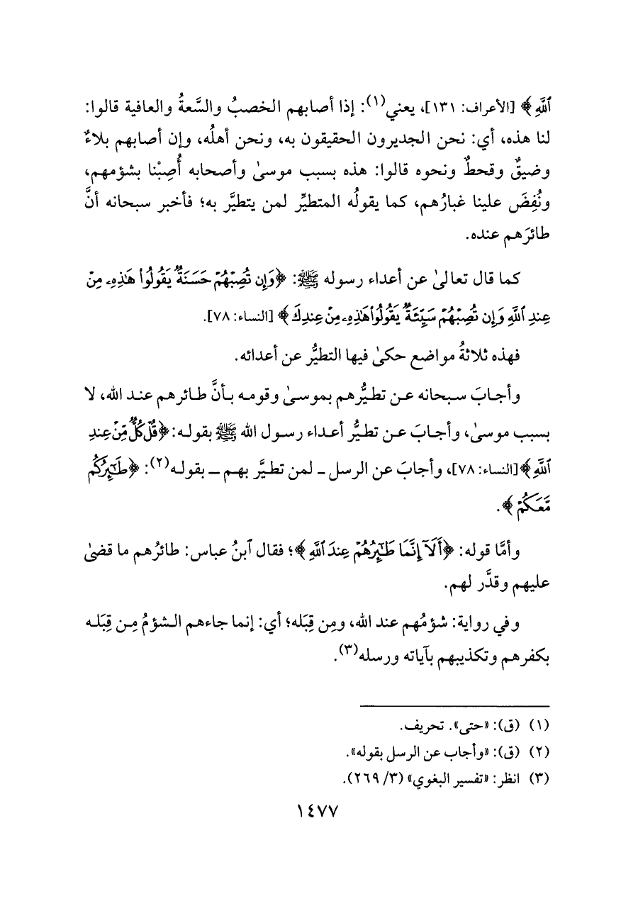 وأجابَ سبحانه عن تطيُّرهم بموسى وقومه بأنَّ طائرهم عند الله، لا بسبب موسى، وأجابَ عن تطيُّر أعداء رسول الله - صلى الله عليه وسلم - بقوله: {قُلْ كُلٌّ مِنْ عِنْدِ اللَّهِ} [النساء: ٧٨]، وأجابَ عن الرسل ــ لمن تطيَّر بهم ــ بقوله (¬٢): {طَائِرُكُمْ مَعَكُمْ}.
