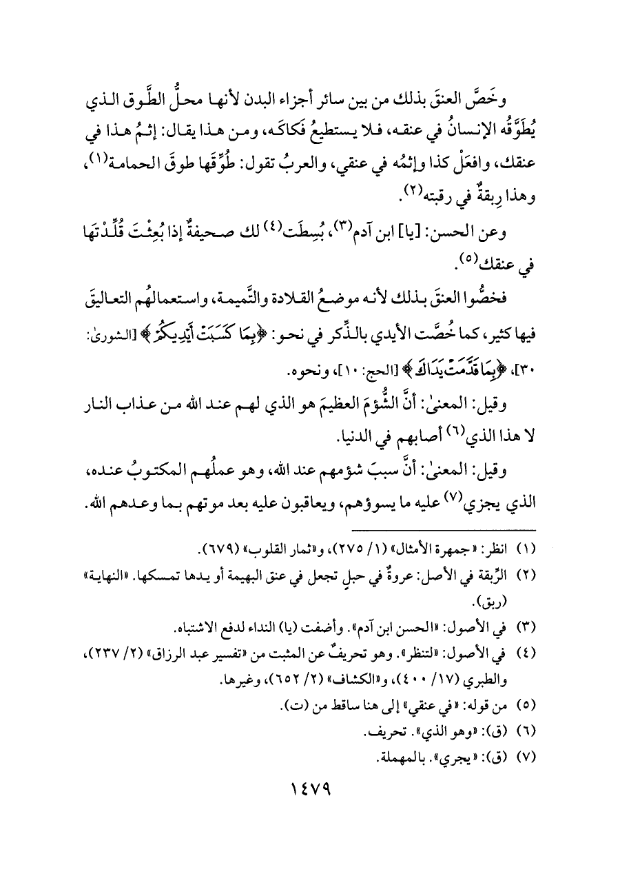 فخصُّوا العنقَ بذلك لأنه موضعُ القلادة والتَّميمة، واستعمالُهم التعاليقَ فيها كثير، كما خُصَّت الأيدي بالذِّكر في نحو: {بِمَا كَسَبَتْ أَيْدِيكُمْ} [الشورى: ٣٠]، {بِمَا قَدَّمَتْ يَدَاكَ} [الحج: ١٠]، ونحوه.