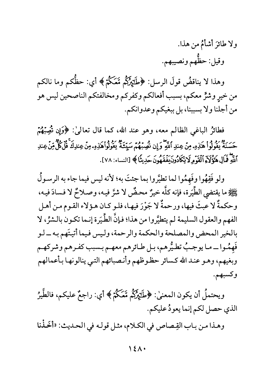ولو فَقِهُوا وفَهِمُوا لما تطيَّروا بما جئتَ به؛ لأنه ليس فيما جاء به الرسولُ - صلى الله عليه وسلم - ما يقتضي الطِّيَرة، فإنه كلَّه خيرٌ محضٌ لا شرَّ فيه، وصلاحٌ لا فسادَ فيه، وحكمةٌ لا عبثَ فيها، ورحمةٌ لا جَوْرَ فيها، فلو كان هؤلاء القوم من أهل الفهم والعقول السليمة لم يتطيَّروا من هذا؛ فإنَّ الطِّيَرة إنما تكون بالشرِّ، لا بالخير المحض والمصلحة والحكمة والرحمة، وليس فيما أتيتَهم به ــ لو فَهِمُوا ــ ما يوجبُ تطيُّرهم، بل طائرهم معهم بسبب كفرهم وشركهم وبغيهم، وهو عند الله كسائر حظوظهم وأنصبائهم التي ينالونها بأعمالهم وكسبهم.