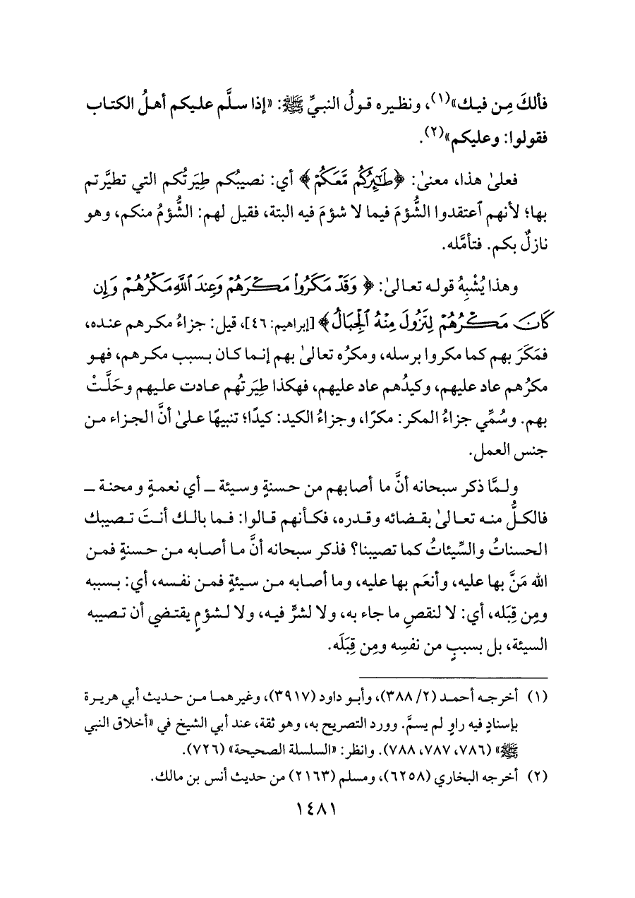 وهذا يُشْبِهُ قوله تعالى: {وَقَدْ مَكَرُوا مَكْرَهُمْ وَعِنْدَ اللَّهِ مَكْرُهُمْ وَإِنْ كَانَ مَكْرُهُمْ لِتَزُولَ مِنْهُ الْجِبَالُ} [إبراهيم: ٤٦]، قيل: جزاءُ مكرهم عنده، فمَكَرَ بهم كما مكروا برسله، ومكرُه تعالى بهم إنما كان بسبب مكرهم، فهو مكرُهم عاد عليهم، وكيدُهم عاد عليهم، فهكذا طِيَرتُهم عادت عليهم وحَلَّتْ بهم. وسُمِّي جزاءُ المكر: مكرًا، وجزاءُ الكيد: كيدًا؛ تنبيهًا على أنَّ الجزاء من جنس العمل.