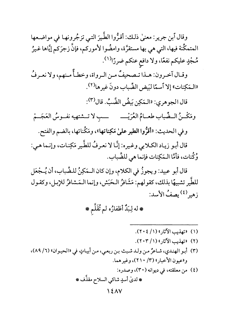وقال آخرون: هذا تصحيفٌ من الرواة، وخطأٌ منهم، ولا نعرفُ «المَكِنات» إلا اسمًا لبَيض الضِّباب دونَ غيرها (¬٢).