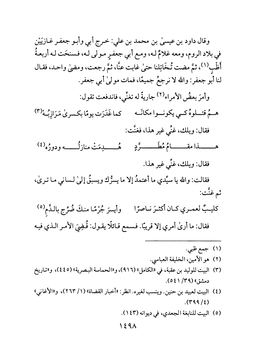 وقال داود بن عيسى بن محمد بن علي: خرج أبي وأبو جعفر غازيَيْن في بلاد الروم، ومعه غلامٌ له، ومع أبي جعفرٍ مولى له، فسنحَت له أربعةُ أَظْبٍ (¬١)، ثمَّ مضت تُخَاتِلنا حتى غابت عنَّا، ثمَّ رجعت، ومضى واحد، فقال لنا أبو جعفر: والله لا نرجعُ جميعًا، فمات مولى أبي جعفر.