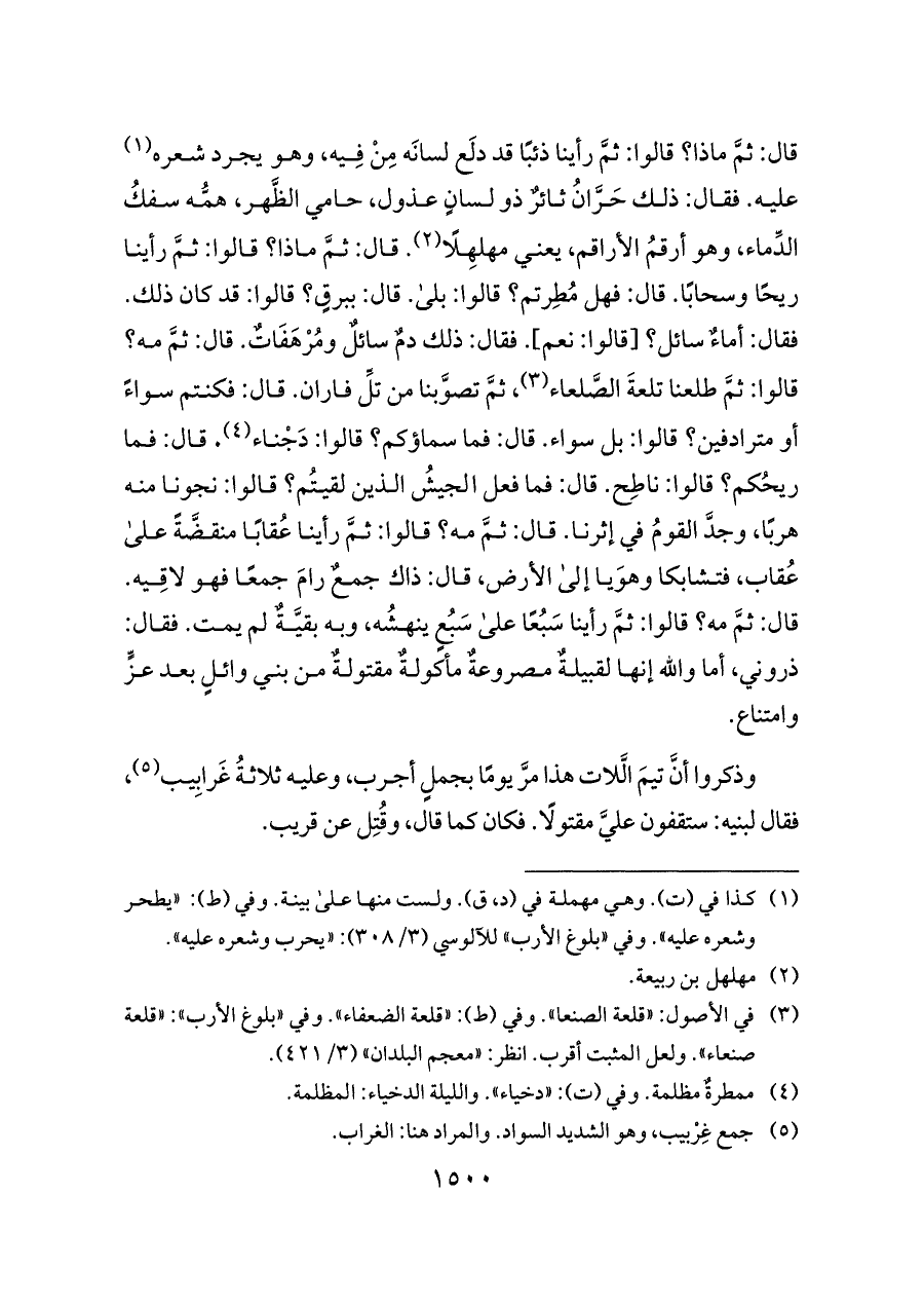 عليه. فقال: ذلك حَرَّانُ ثائرٌ ذو لسانٍ عذول، حامي الظَّهر، همُّه سفكُ الدِّماء، وهو أرقمُ الأراقم، يعني مهلهِلًا (¬٢). قال: ثمَّ ماذا؟ قالوا: ثمَّ رأينا ريحًا وسحابًا. قال: فهل مُطِرتم؟ قالوا: بلى. قال: ببرقٍ؟ قالوا: قد كان ذلك. فقال: أماءٌ سائل؟ [قالوا: نعم]. فقال: ذلك دمٌ سائلٌ ومُرْهَفَاتٌ. قال: ثمَّ مه؟ قالوا: ثمَّ طلعنا تلعةَ الصَّلعاء (¬٣)، ثمَّ تصوَّبنا من تلِّ فاران. قال: فكنتم سواءً أو مترادفين؟ قالوا: بل سواء. قال: فما سماؤكم؟ قالوا: دَجْناء (¬٤). قال: فما ريحُكم؟ قالوا: ناطِح. قال: فما فعل الجيشُ الذين لقيتُم؟ قالوا: نجونا منه هربًا، وجدَّ القومُ في إثرنا. قال: ثمَّ مه؟ قالوا: ثمَّ رأينا عُقابًا منقضَّةً على عُقاب، فتشابكا وهوَيا إلى الأرض، قال: ذاك جمعٌ رامَ جمعًا فهو لاقِيه. قال: ثمَّ مه؟ قالوا: ثمَّ رأينا سَبُعًا على سَبُعٍ ينهشُه، وبه بقيَّةٌ لم يمت. فقال: ذروني، أما والله إنها لقبيلةٌ مصروعةٌ مأكولةٌ مقتولةٌ من بني وائلٍ بعد عزٍّ وامتناع.