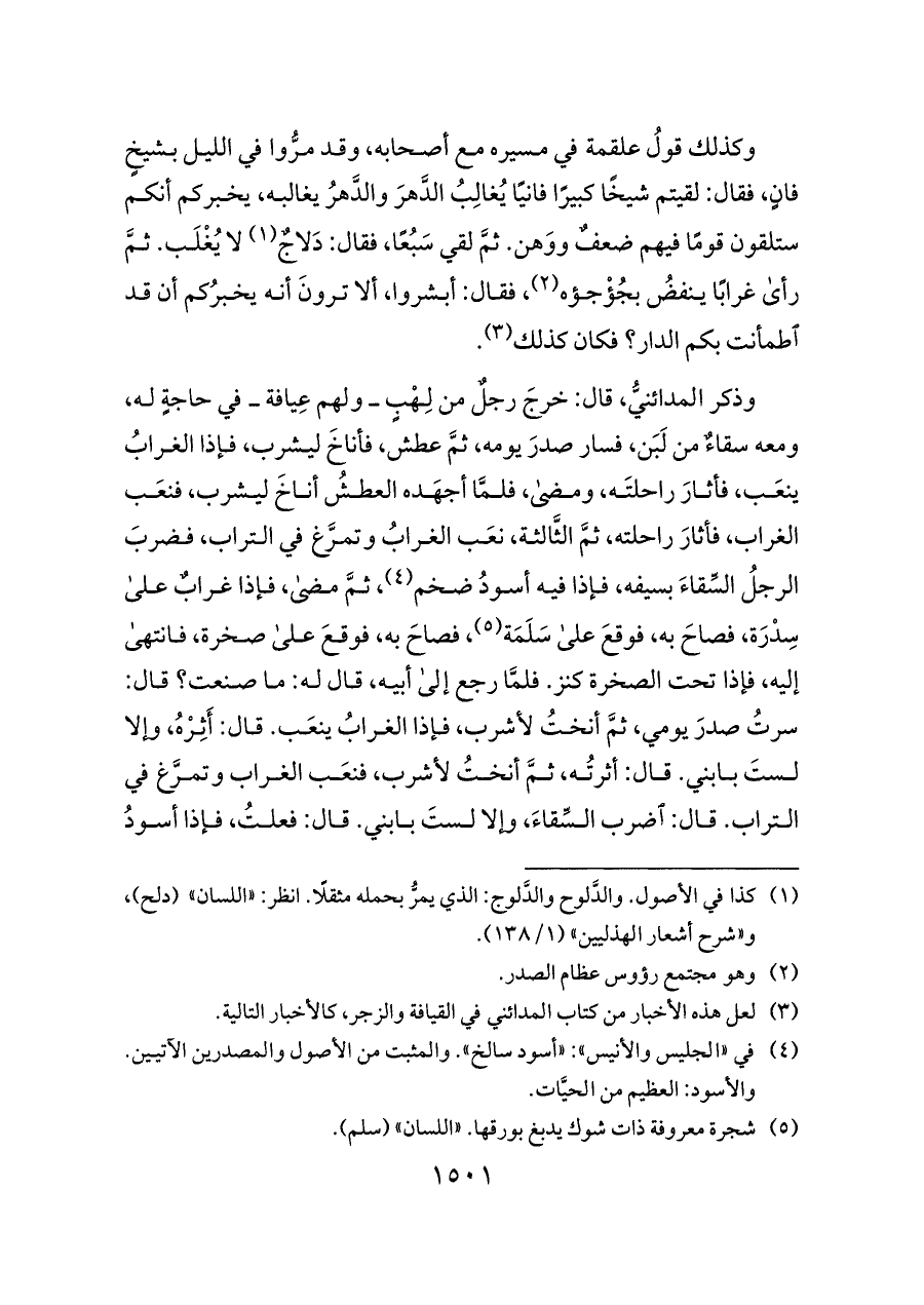 وكذلك قولُ علقمة في مسيره مع أصحابه، وقد مرُّوا في الليل بشيخٍ فانٍ، فقال: لقيتم شيخًا كبيرًا فانيًا يُغالِبُ الدَّهرَ والدَّهرُ يغالبه، يخبركم أنكم ستلقون قومًا فيهم ضعفٌ ووَهن. ثمَّ لقي سَبُعًا، فقال: دَلاجٌ (¬١) لا يُغْلَب. ثمَّ رأى غرابًا ينفضُ بجُؤْجؤه (¬٢)، فقال: أبشروا، ألا ترونَ أنه يخبرُكم أن قد اطمأنت بكم الدار؟ فكان كذلك (¬٣).