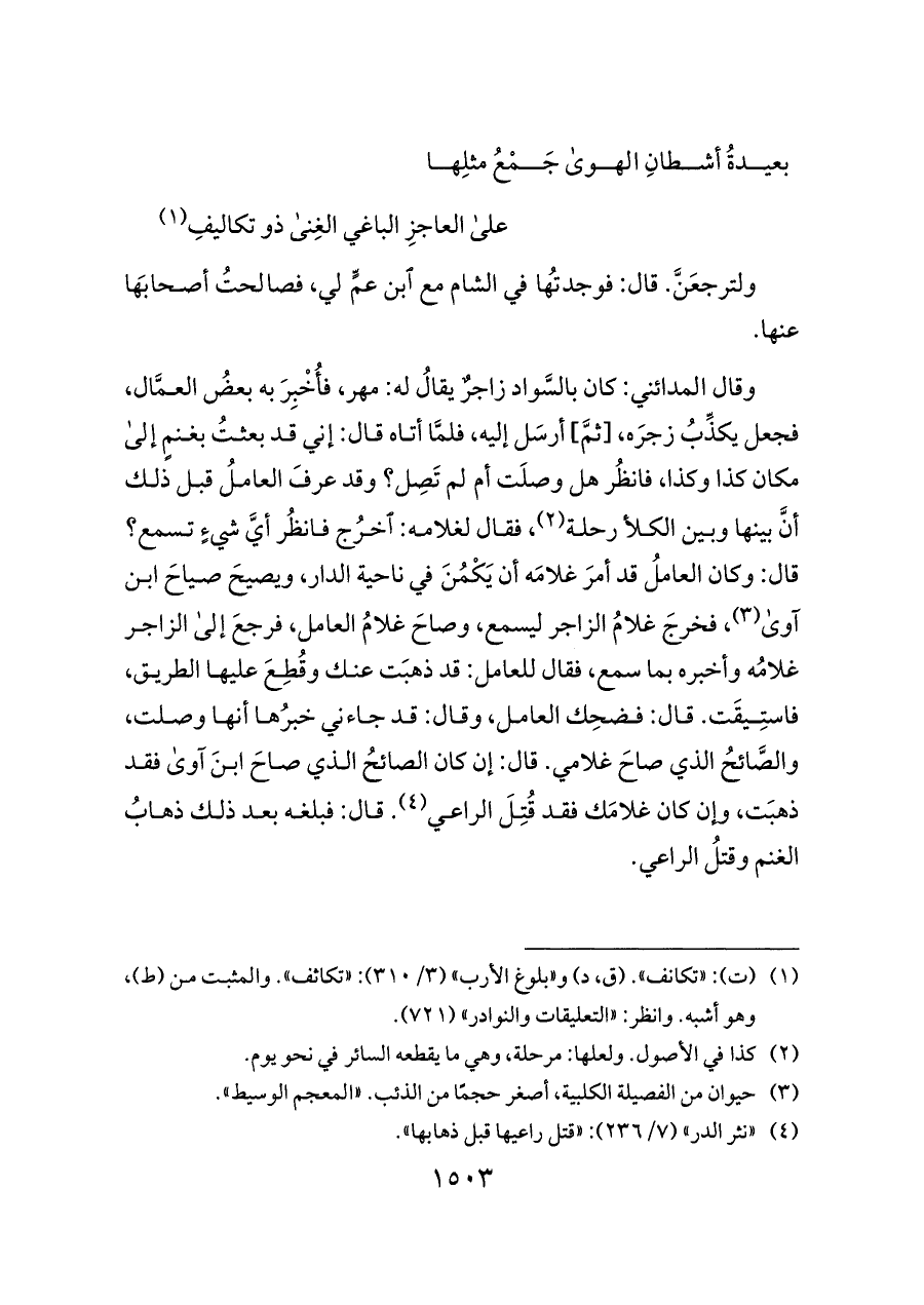 بعيدةُ أشطانِ الهوى جَمْعُ مثلِها ... على العاجزِ الباغي الغِنى ذو تكاليفِ (¬١)