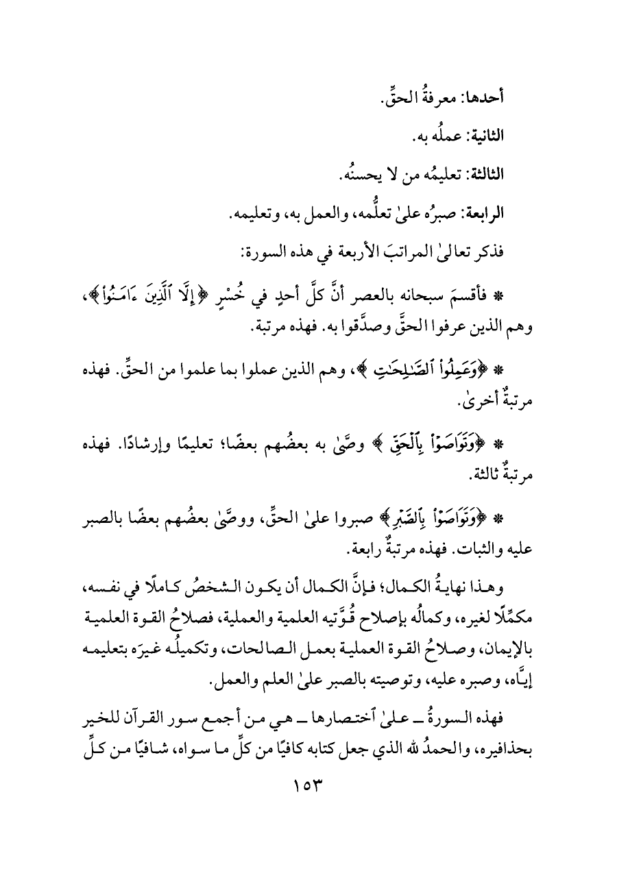 وهذا نهايةُ الكمال؛ فإنَّ الكمال أن يكون الشخصُ كاملًا في نفسه، مكمِّلًا لغيره، وكمالُه بإصلاح قُوَّتيه العلمية والعملية، فصلاحُ القوة العلمية بالإيمان، وصلاحُ القوة العملية بعمل الصالحات، وتكميلُه غيرَه بتعليمه إيَّاه، وصبره عليه، وتوصيته بالصبر على العلم والعمل.