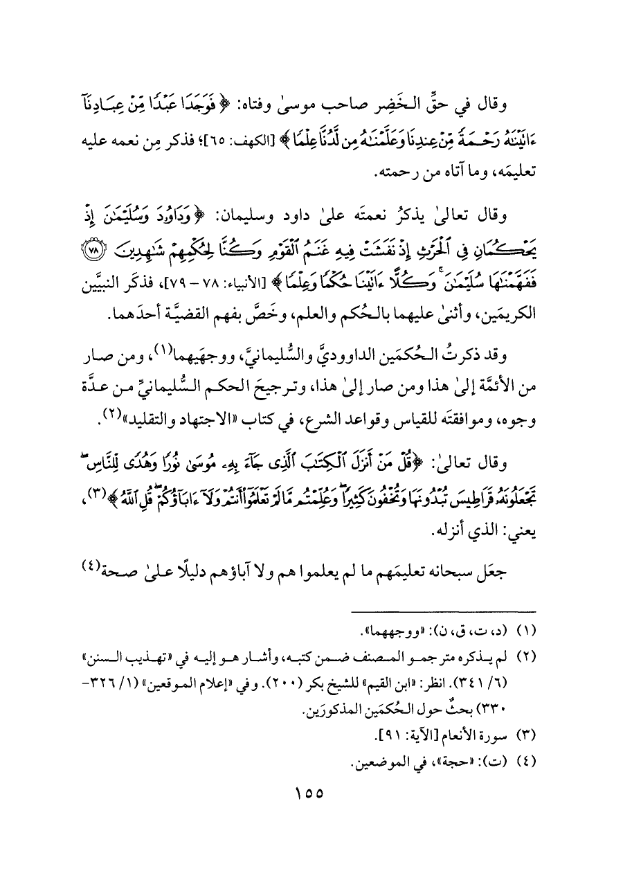 وقال تعالى يذكرُ نعمتَه على داود وسليمان: {وَدَاوُودَ وَسُلَيْمَانَ إِذْ يَحْكُمَانِ فِي الْحَرْثِ إِذْ نَفَشَتْ فِيهِ غَنَمُ الْقَوْمِ وَكُنَّا لِحُكْمِهِمْ شَاهِدِينَ (٧٨) فَفَهَّمْنَاهَا سُلَيْمَانَ وَكُلًّا آتَيْنَا حُكْمًا وَعِلْمًا} [الأنبياء: ٧٨ - ٧٩]، فذكَر النبيَّين الكريمَين، وأثنى عليهما بالحُكم والعلم، وخَصَّ بفهم القضيَّة أحدَهما.