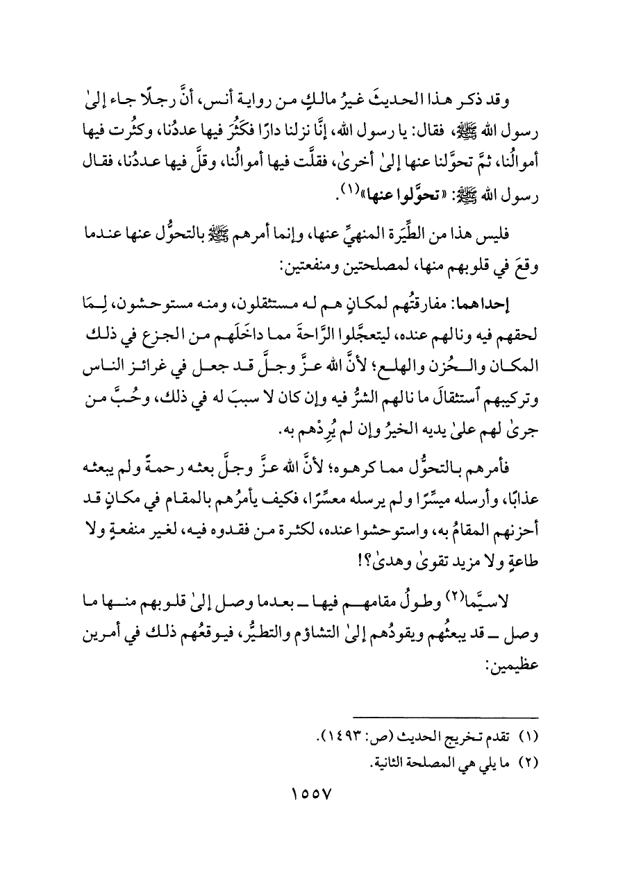 فليس هذا من الطِّيَرة المنهيِّ عنها، وإنما أمرهم - صلى الله عليه وسلم - بالتحوُّل عنها عندما وقعَ في قلوبهم منها، لمصلحتين ومنفعتين: