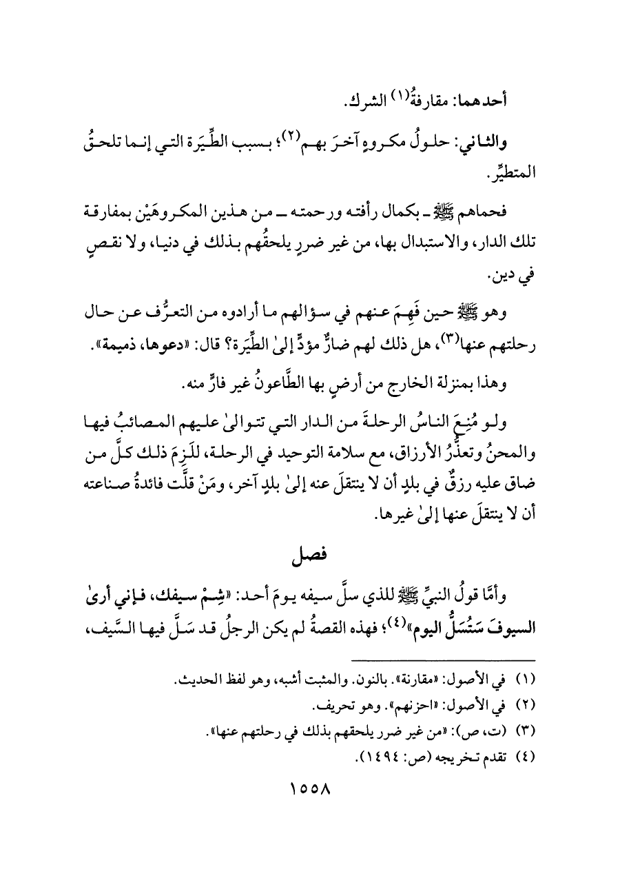 ولو مُنِعَ الناسُ الرحلةَ من الدار التي تتوالى عليهم المصائبُ فيها والمحنُ وتعذُّرُ الأرزاق، مع سلامة التوحيد في الرحلة، للَزِمَ ذلك كلَّ من ضاق عليه رزقٌ في بلدٍ أن لا ينتقلَ عنه إلى بلدٍ آخر، ومَنْ قلَّت فائدةُ صناعته أن لا ينتقلَ عنها إلى غيرها.