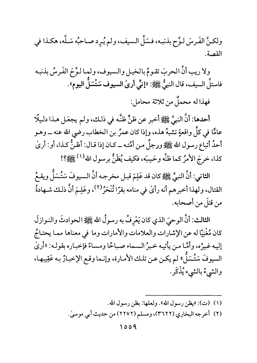 الثالث: أنَّ الوحيَ الذي كان يَعْرِفُ به رسولُ الله - صلى الله عليه وسلم - الحوادثَ والنوازلَ كان مُغْنِيًا له عن الإشارات والعلامات والأمارات وما في معناها مما يحتاجُ إليه غيرُه، وأمَّا من يأتيه خبرُ السماء صباحًا ومساءً فإخباره بقوله: «أرى السيوفَ سَتُسَلُّ» لم يكن عن تلك الأمارة، وإنما وقع الإخبارُ به عَقِيبها، والشيءُ بالشيء يُذْكَر.