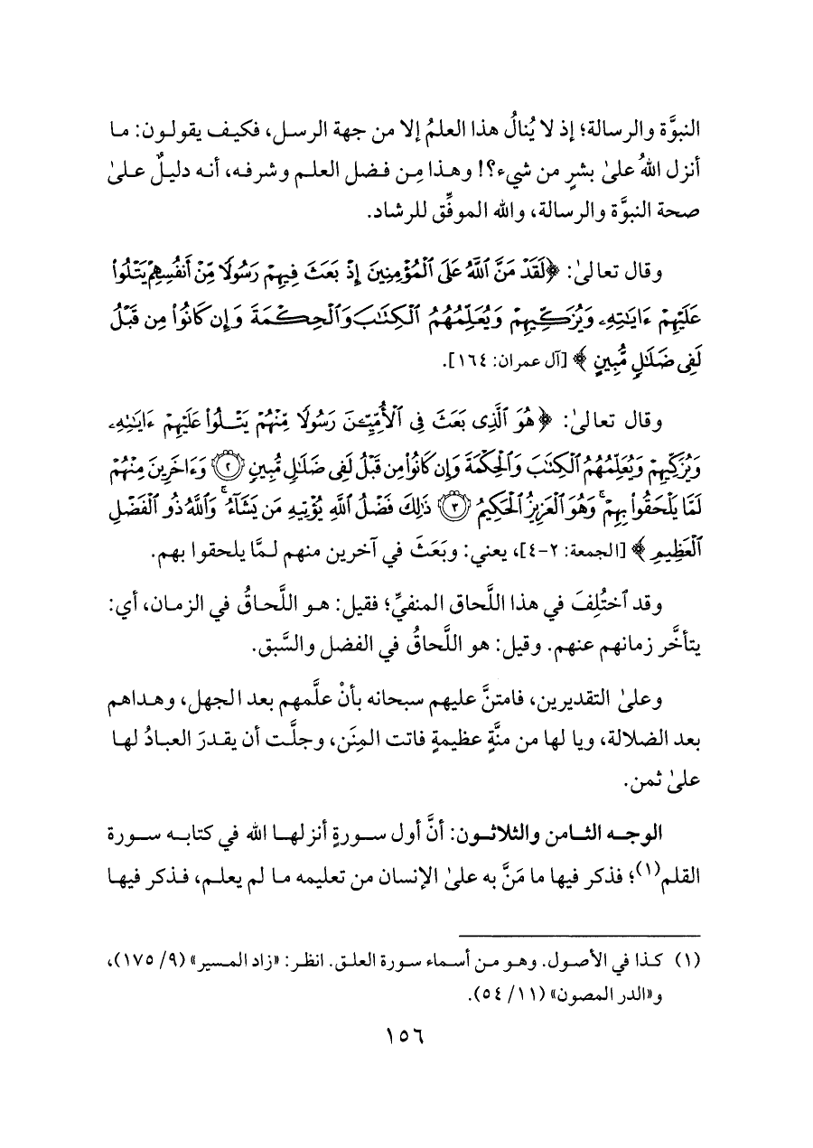 وعلى التقديرين، فامتنَّ عليهم سبحانه بأنْ علَّمهم بعد الجهل، وهداهم بعد الضلالة، ويا لها من منَّةٍ عظيمةٍ فاتت المِنَن، وجلَّت أن يقدرَ العبادُ لها على ثمن.
