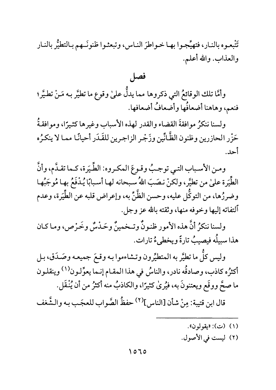 ولسنا ننكرُ موافقةَ القضاء والقدر لهذه الأسباب وغيرها كثيرًا، وموافقةُ حَزْر الحازرين وظنون الظَّانِّين وزَجْر الزاجرين للقَدَر أحيانًا مما لا ينكرُه أحد.