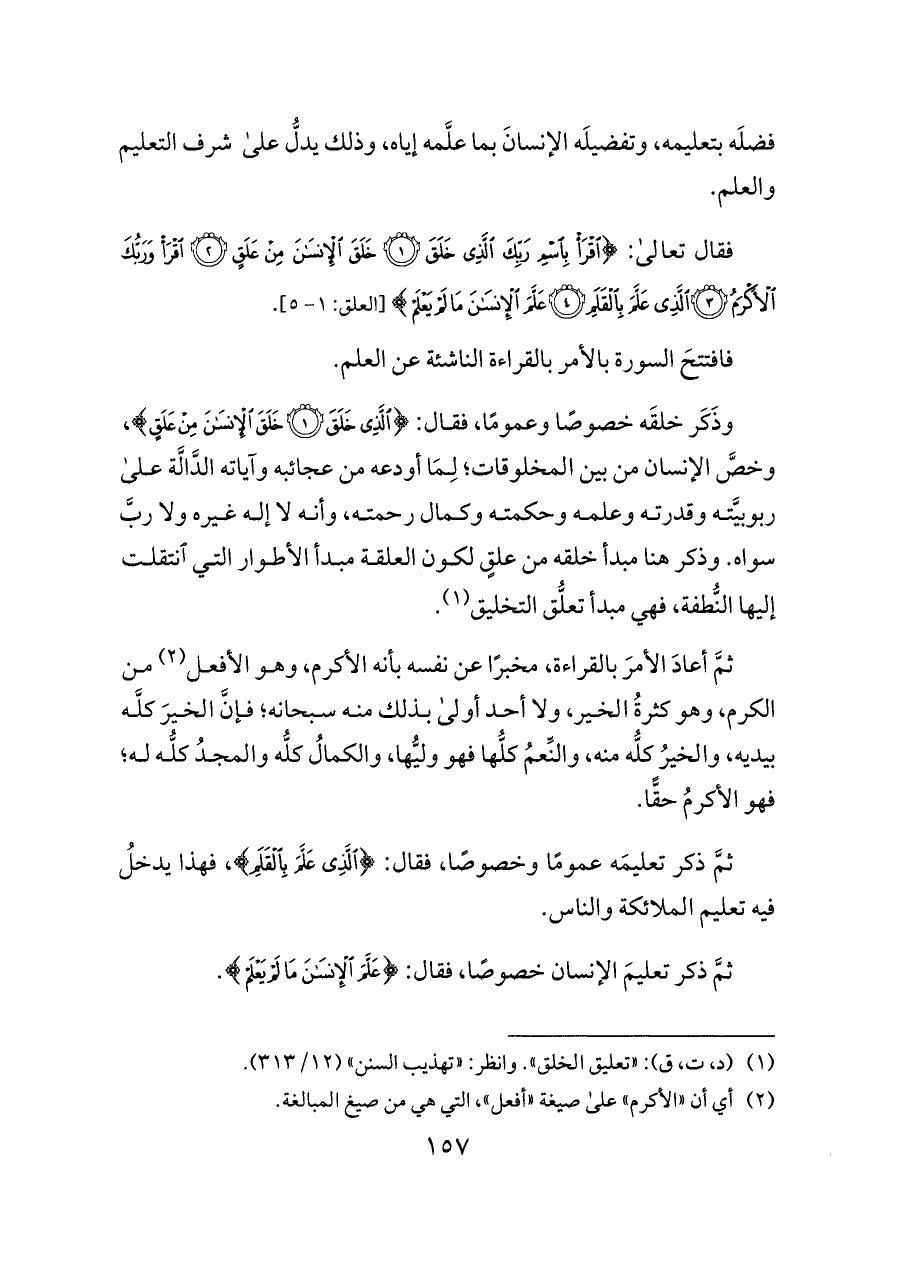 وذَكَر خلقَه خصوصًا وعمومًا، فقال: {الَّذِي خَلَقَ (١) خَلَقَ الْإِنْسَانَ مِنْ عَلَقٍ}، وخصَّ الإنسان من بين المخلوقات؛ لِمَا أودعه من عجائبه وآياته الدَّالَّة على ربوبيَّته وقدرته وعلمه وحكمته وكمال رحمته، وأنه لا إله غيره ولا ربَّ سواه. وذكر هنا مبدأ خلقه من علقٍ لكون العلقة مبدأ الأطوار التي انتقلت إليها النُّطفة، فهي مبدأ تعلُّق التخليق (¬١).