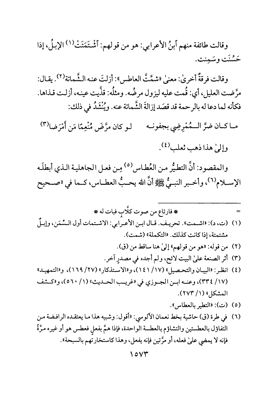 (¬٦) في طرة (ق) حاشية بخط نعمان الآلوسي: «أقول: وشبيه هذا ما يعتقده الرافضة من التفاؤل بالعطستين والتشاؤم بالعطسة الواحدة، فإذا همَّ بفعلٍ فعطس هو أو غيره مرَّةً فإنه لا يمضي على فعله، أو مرَّتين فإنه يفعل، وهذا كاستخارتهم بالسبحة».