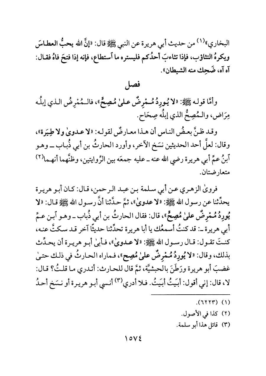 فروى الزهري عن أبي سلمة بن عبد الرحمن، قال: كان أبو هريرة يحدِّثنا عن رسول الله - صلى الله عليه وسلم -: «لا عدوى»، ثمَّ حدَّثنا أنَّ رسول الله - صلى الله عليه وسلم - قال: «لا يُورِدُ مُمْرِضٌ على مُصِحٍّ»، قال: فقال الحارثُ بن أبي ذُباب ــ وهو ابن عمِّ أبي هريرة ــ: قد كنتُ أسمعُك يا أبا هريرة تحدِّثنا حديثًا آخر قد سكتَّ عنه، كنتَ تقول: قال رسول الله - صلى الله عليه وسلم -: «لا عدوى»، فأبى أبو هريرة أن يحدِّث بذلك، وقال: «لا يُورِدُ مُمْرِضٌ على مُصِح»، فماراه الحارثُ في ذلك حتى غضبَ أبو هريرة ورَطَنَ بالحبشيَّة، ثمَّ قال للحارث: أتدري ما قلتُ؟ قال: لا، قال: إني أقول: أبَيتُ أبَيتُ. فلا أدري (¬٣) أنسي أبو هريرة أو نسَخ أحدُ