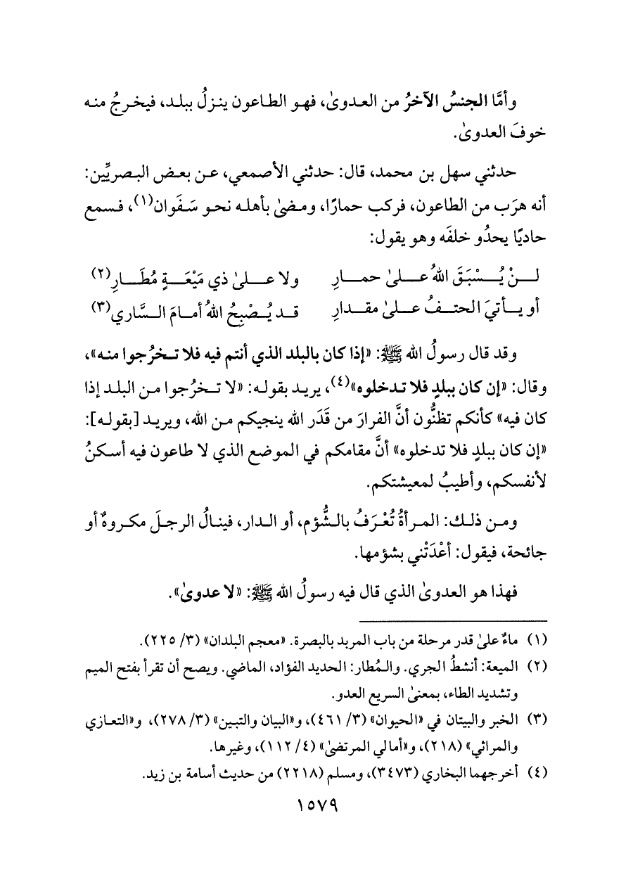 وأمَّا الجنسُ الآخرُ من العدوى، فهو الطاعون ينزلُ ببلد، فيخرجُ منه خوفَ العدوى.