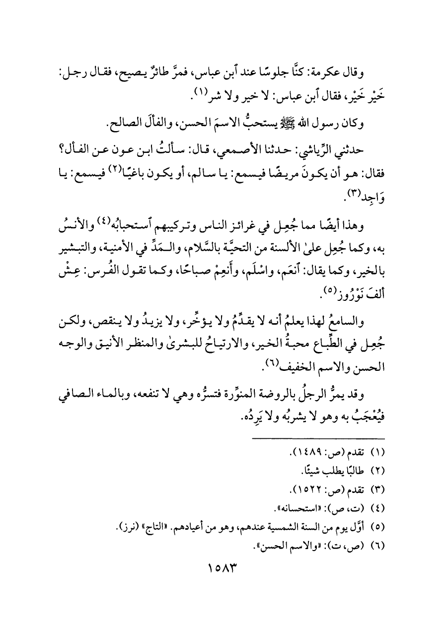 وهذا أيضًا مما جُعِل في غرائز الناس وتركيبهم استحبابُه (¬٤) والأنسُ به، وكما جُعِل على الألسنة من التحيَّة بالسَّلام، والمَدِّ في الأمنية، والتبشير بالخير، وكما يقال: انعَم، واسْلَم، وأَنعِمْ صباحًا، وكما تقول الفُرس: عِشْ ألفَ نَوْرُوز (¬٥).