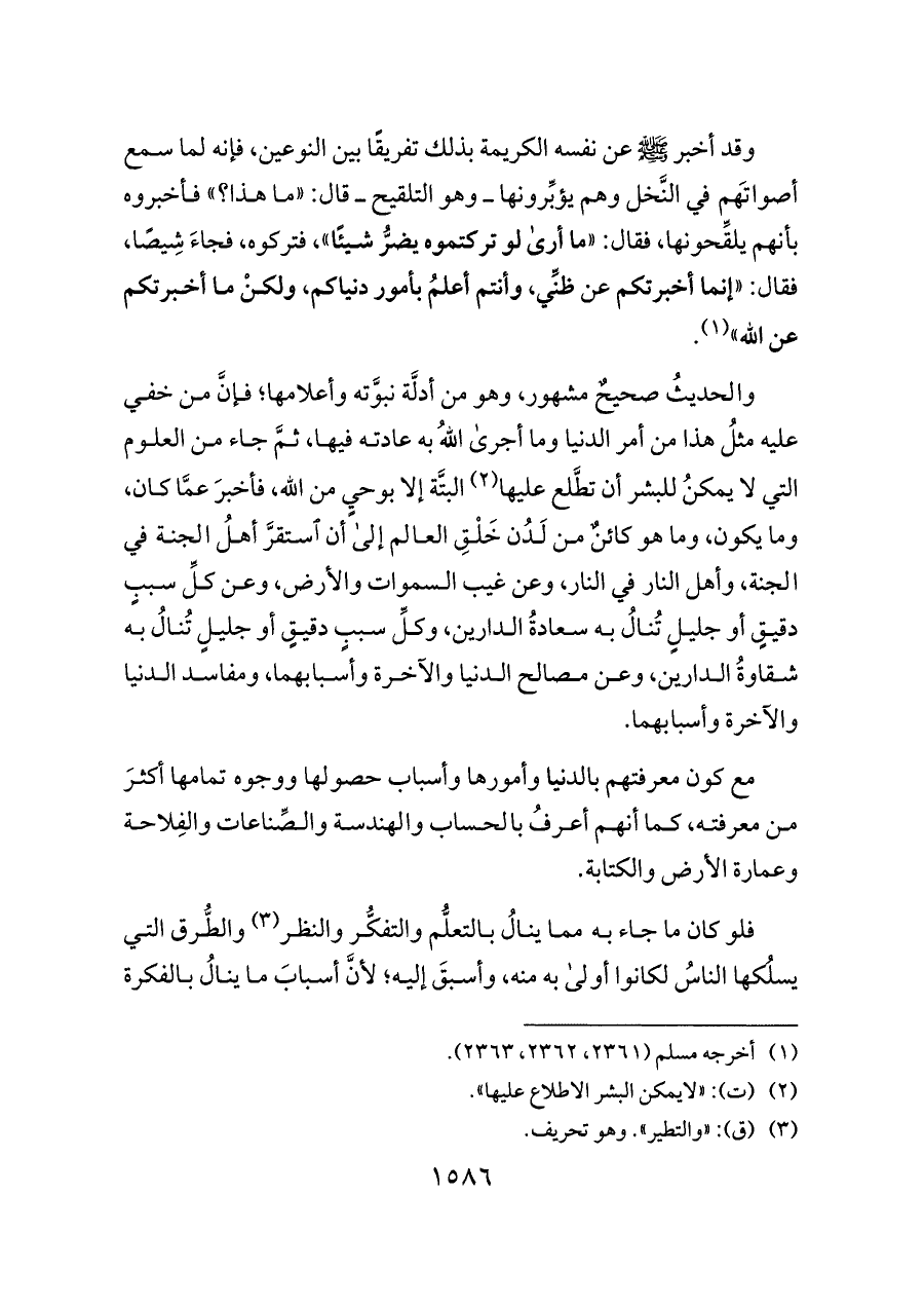 والحديثُ صحيحٌ مشهور، وهو من أدلَّة نبوَّته وأعلامها؛ فإنَّ من خفي عليه مثلُ هذا من أمر الدنيا وما أجرى اللهُ به عادته فيها، ثمَّ جاء من العلوم التي لا يمكنُ للبشر أن تطَّلع عليها (¬٢) البتَّة إلا بوحيٍ من الله، فأخبرَ عمَّا كان، وما يكون، وما هو كائنٌ من لَدُن خَلْقِ العالم إلى أن استقرَّ أهلُ الجنة في الجنة، وأهل النار في النار، وعن غيب السموات والأرض، وعن كلِّ سببٍ دقيقٍ أو جليلٍ تُنالُ به سعادةُ الدارين، وكلِّ سببٍ دقيقٍ أو جليلٍ تُنالُ به شقاوةُ الدارين، وعن مصالح الدنيا والآخرة وأسبابهما، ومفاسد الدنيا والآخرة وأسبابهما.