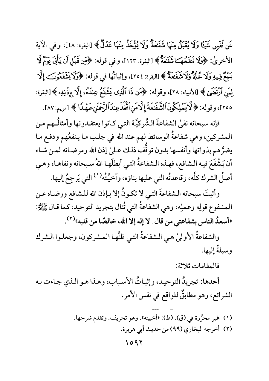 وأثبتَ سبحانه الشفاعةَ التي لا تكونُ إلا بإذن الله للشافع ورضاه عن المشفوع قولِه وعملِه، وهي الشفاعةُ التي تُنال بتجريد التوحيد، كما قال - صلى الله عليه وسلم -: «أسعدُ الناس بشفاعتي من قال: لا إله إلا الله، خالصًا من قلبه» (¬٢).