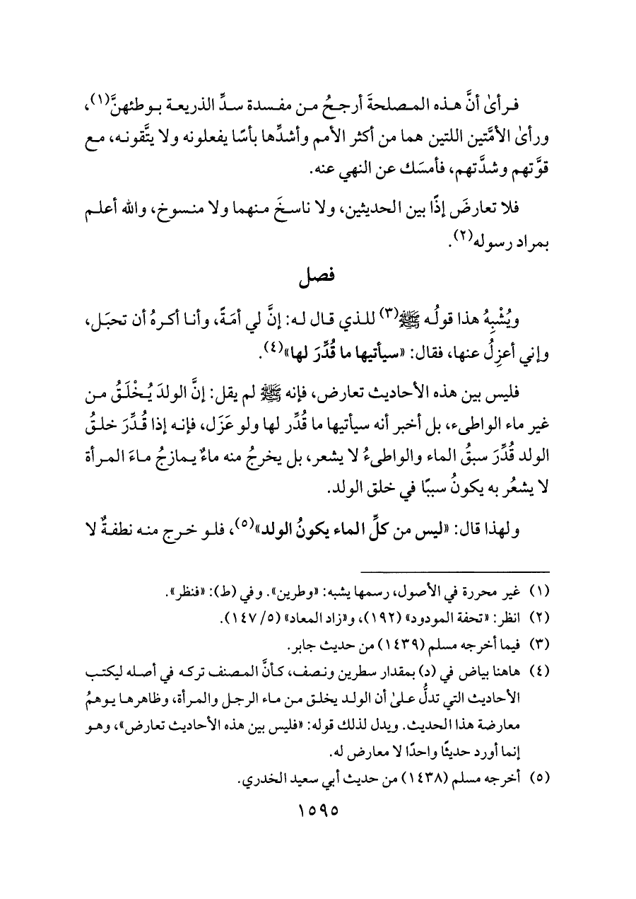 (¬٤) هاهنا بياض في (د) بمقدار سطرين ونصف، كأنَّ المصنف تركه في أصله ليكتب الأحاديث التي تدلُّ على أن الولد يخلق من ماء الرجل والمرأة، وظاهرها يوهمُ معارضة هذا الحديث. ويدل لذلك قوله: «فليس بين هذه الأحاديث تعارض»، وهو إنما أورد حديثًا واحدًا لا معارض له.