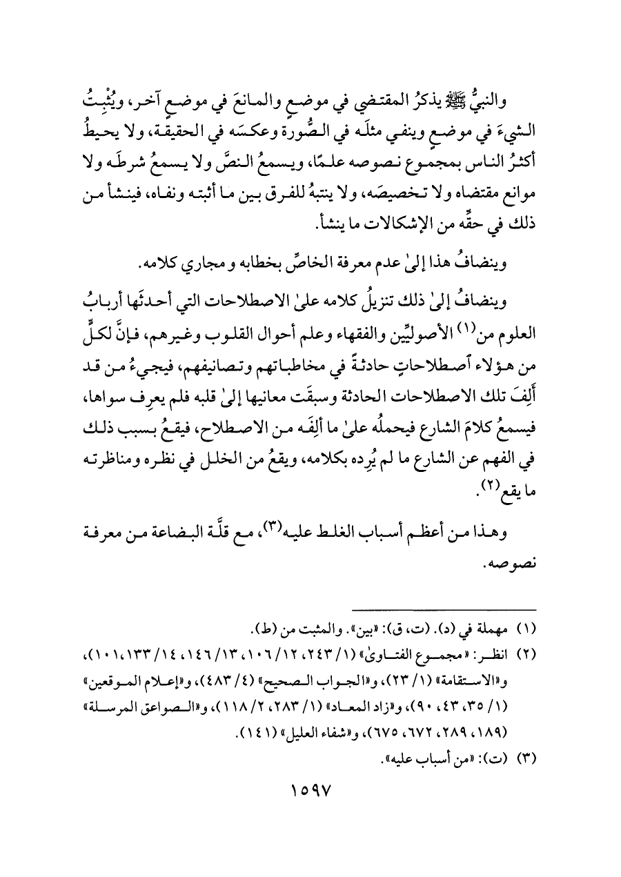 والنبيُّ - صلى الله عليه وسلم - يذكرُ المقتضي في موضعٍ والمانعَ في موضعٍ آخر، ويُثْبِتُ الشيءَ في موضعٍ وينفي مثلَه في الصُّورة وعكسَه في الحقيقة، ولا يحيطُ أكثرُ الناس بمجموع نصوصه علمًا، ويسمعُ النصَّ ولا يسمعُ شرطَه ولا موانع مقتضاه ولا تخصيصَه، ولا ينتبهُ للفرق بين ما أثبته ونفاه، فينشأ من ذلك في حقِّه من الإشكالات ما ينشأ.
