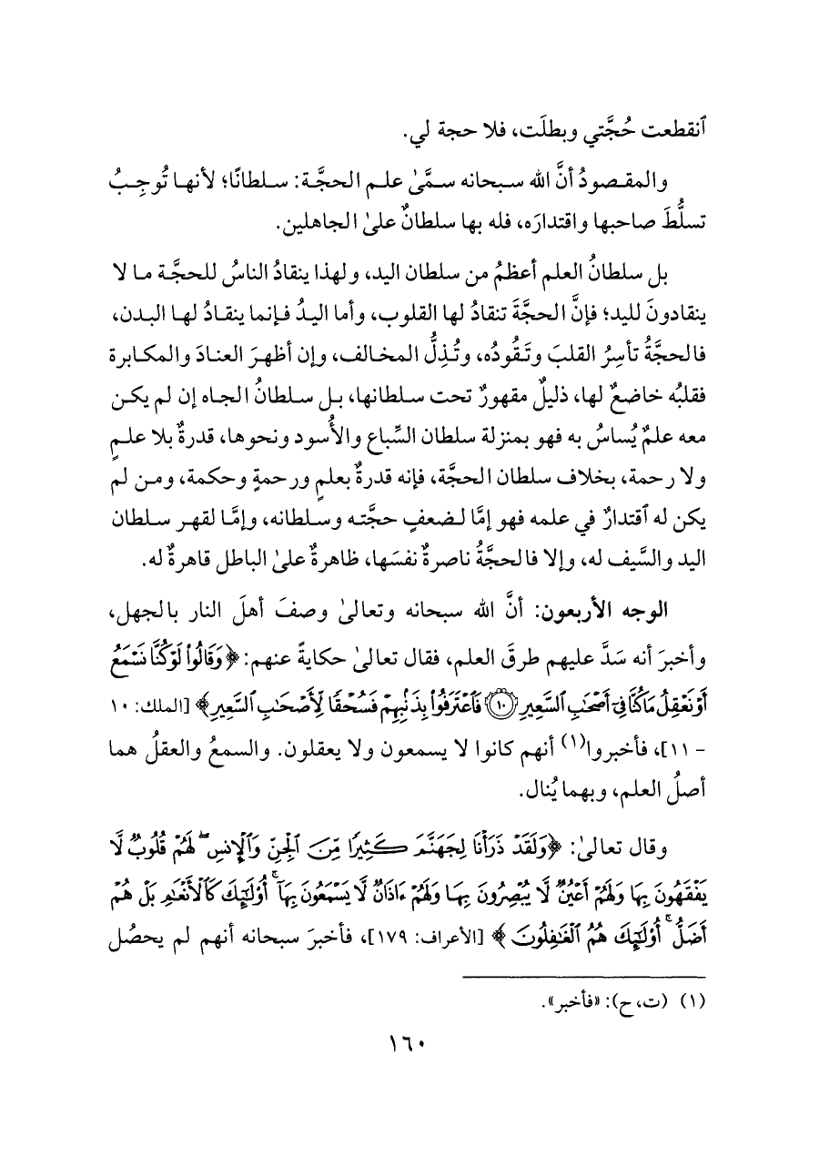 والمقصودُ أنَّ الله سبحانه سمَّى علم الحجَّة: سلطانًا؛ لأنها تُوجِبُ تسلُّطَ صاحبها واقتدارَه، فله بها سلطانٌ على الجاهلين.