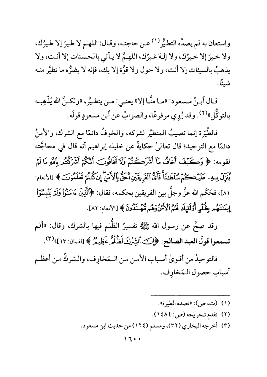 فالطِّيَرة إنما تصيبُ المتطيِّر لشركه، والخوفُ دائمًا مع الشرك، والأمنُ دائمًا مع التوحيد؛ قال تعالى حكايةً عن خليله إبراهيم أنه قال في محاجَّته لقومه: {وَكَيْفَ أَخَافُ مَا أَشْرَكْتُمْ وَلَا تَخَافُونَ أَنَّكُمْ أَشْرَكْتُمْ بِاللَّهِ مَا لَمْ يُنَزِّلْ بِهِ عَلَيْكُمْ سُلْطَانًا فَأَيُّ الْفَرِيقَيْنِ أَحَقُّ بِالْأَمْنِ إِنْ كُنْتُمْ تَعْلَمُونَ} [الأنعام: ٨١]، فحَكَم الله عزَّ وجلَّ بين الفريقين بحكمه، فقال: {الَّذِينَ آمَنُوا وَلَمْ يَلْبِسُوا إِيمَانَهُمْ بِظُلْمٍ أُولَئِكَ لَهُمُ الْأَمْنُ وَهُمْ مُهْتَدُونَ} [الأنعام: ٨٢].