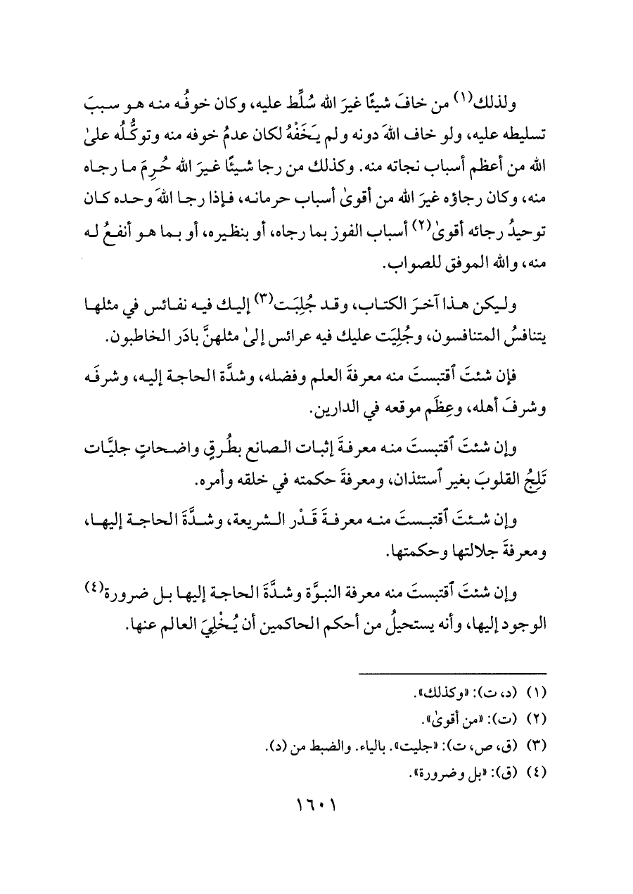 وإن شئتَ اقتبستَ منه معرفة النبوَّة وشدَّةَ الحاجة إليها بل ضرورة (¬٤) الوجود إليها، وأنه يستحيلُ من أحكم الحاكمين أن يُخْلِيَ العالم عنها.