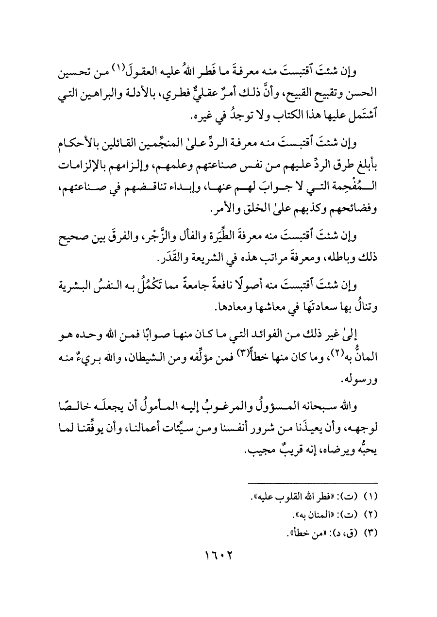 وإن شئتَ اقتبستَ منه أصولًا نافعةً جامعةً مما تَكْمُلُ به النفسُ البشرية وتنالُ بها سعادتَها في معاشها ومعادها.