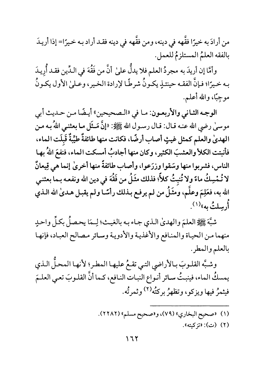 الوجه الثاني والأربعون: ما في «الصحيحين» أيضًا من حديث أبي موسى رضي الله عنه قال: قال رسول الله - صلى الله عليه وسلم -: «إنَّ مَثَل ما بعثني اللهُ به من الهدى والعلم كمثل غيثٍ أصاب أرضًا، فكانت منها طائفةٌ طيِّبةٌ قَبِلَت الماء، فأنبتت الكلأ والعشبَ الكثير، وكان منها أجادبُ أمسكت الماء، فنفعَ اللهُ بها الناس، فشربوا منها وسَقوا وزرَعوا، وأصاب طائفةً منها أخرى إنما هي قِيعانٌ لا تُمْسِكُ ماءً ولا تُنبِتُ كلأً؛ فذلك مثَلُ من فَقُهَ في دين الله ونفعه بما بعثني الله به، فعَلِمَ وعلَّم، ومثَلُ من لم يرفع بذلك رأسًا ولم يقبل هدى الله الذي أُرسِلتُ به» (¬١).