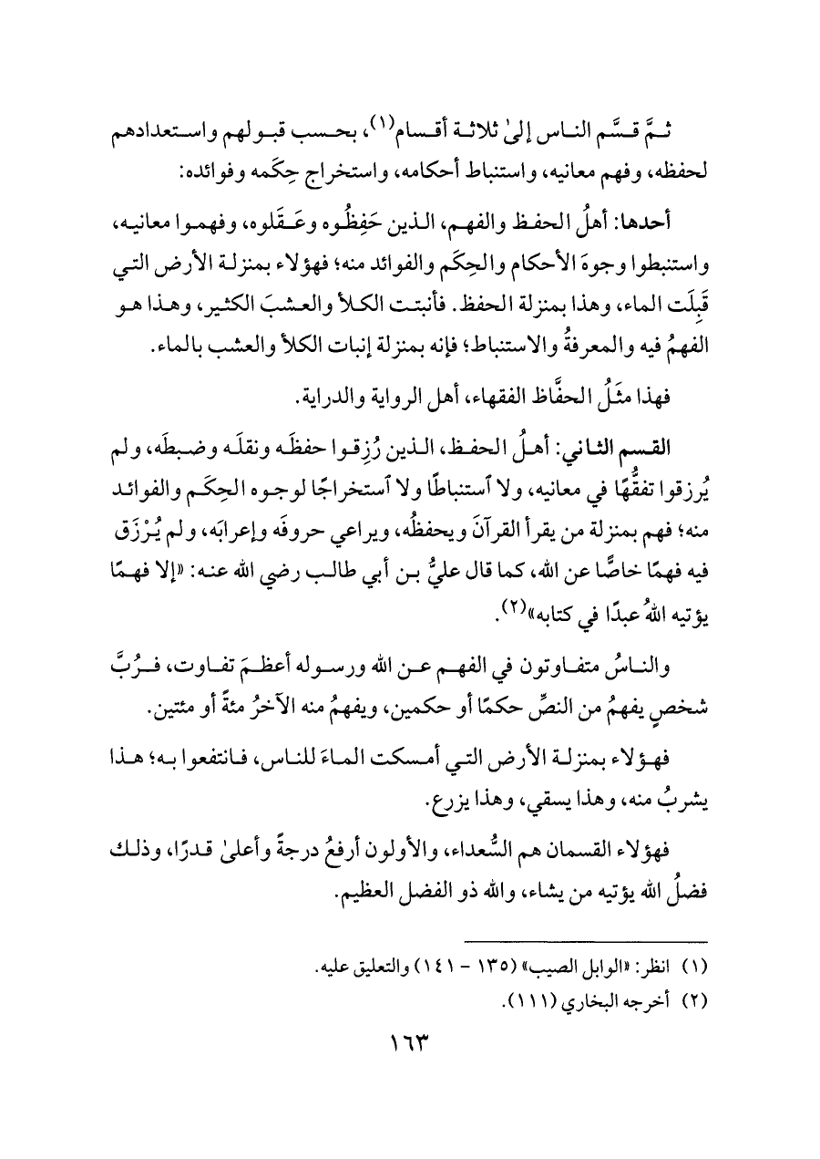 أحدها: أهلُ الحفظ والفهم، الذين حَفِظُوه وعَقَلوه، وفهموا معانيه، واستنبطوا وجوهَ الأحكام والحِكَم والفوائد منه؛ فهؤلاء بمنزلة الأرض التي قَبِلَت الماء، وهذا بمنزلة الحفظ. فأنبتت الكلأ والعشبَ الكثير، وهذا هو الفهمُ فيه والمعرفةُ والاستنباط؛ فإنه بمنزلة إنبات الكلأ والعشب بالماء.
