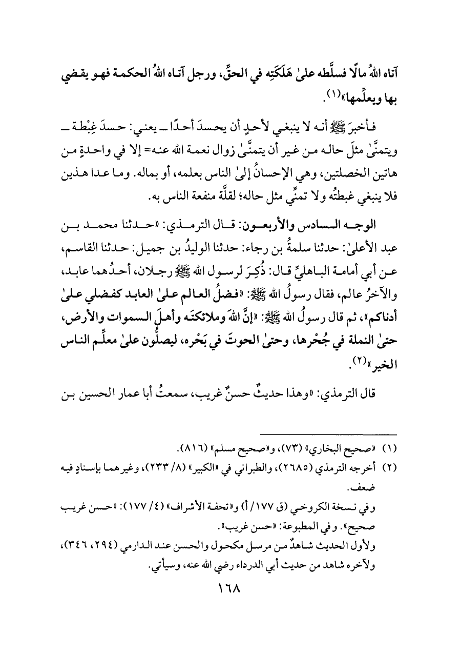 آتاه اللهُ مالًا فسلَّطه على هَلَكَتِه في الحقِّ، ورجل آتاه اللهُ الحكمة فهو يقضي بها ويعلِّمها» (¬١).
