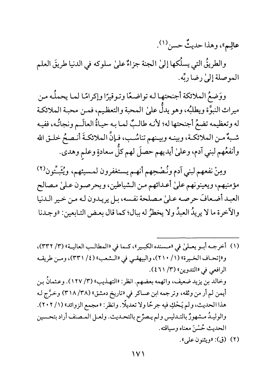 ووَضعُ الملائكة أجنحتها له تواضعًا وتوقيرًا وإكرامًا لما يحملُه من ميراث النبوَّة ويطلبُه، وهو يدلُّ على المحبة والتعظيم، فمن محبة الملائكة له وتعظيمه تضعُ أجنحتها له؛ لأنه طالبٌ لما به حياةُ العالَم ونجاتُه، ففيه شبهٌ من الملائكة، وبينه وبينهم تناسُب، فإنَّ الملائكةَ أنصحُ خلق الله وأنفعُهم لبني آدم، وعلى أيديهم حصلَ لهم كلُّ سعادةٍ وعلمٍ وهدى.