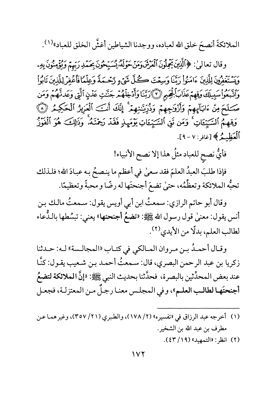 وقال أبو حاتم الرازي: سمعتُ ابن أبي أويس يقول: سمعتُ مالك بن أنس يقول: معنى قول رسول الله - صلى الله عليه وسلم -: «تضعُ أجنحتها» يعني: تبسُطها بالدُّعاء لطالب العلم، بدلًا من الأيدي (¬٢).