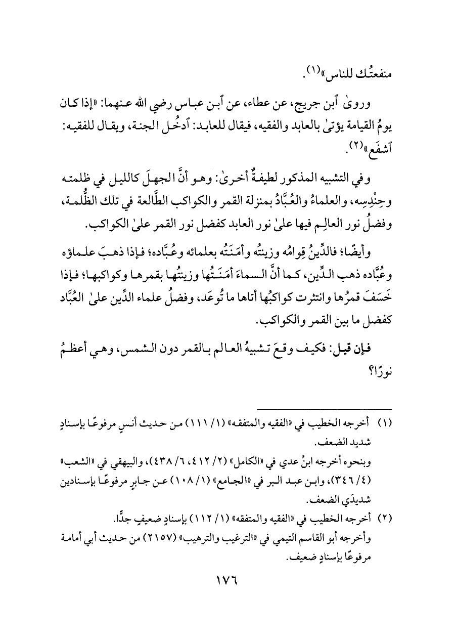 وأيضًا؛ فالدِّينُ قِوامُه وزينتُه وأمَنَتُه بعلمائه وعُبَّاده؛ فإذا ذهبَ علماؤه وعُبَّاده ذهب الدِّين، كما أنَّ السماءَ أمَنَتُها وزينتُها بقمرها وكواكبها؛ فإذا خَسَفَ قمرُها وانتثرت كواكبُها أتاها ما تُوعَد، وفضلُ علماء الدِّين على العُبَّاد كفضل ما بين القمر والكواكب.