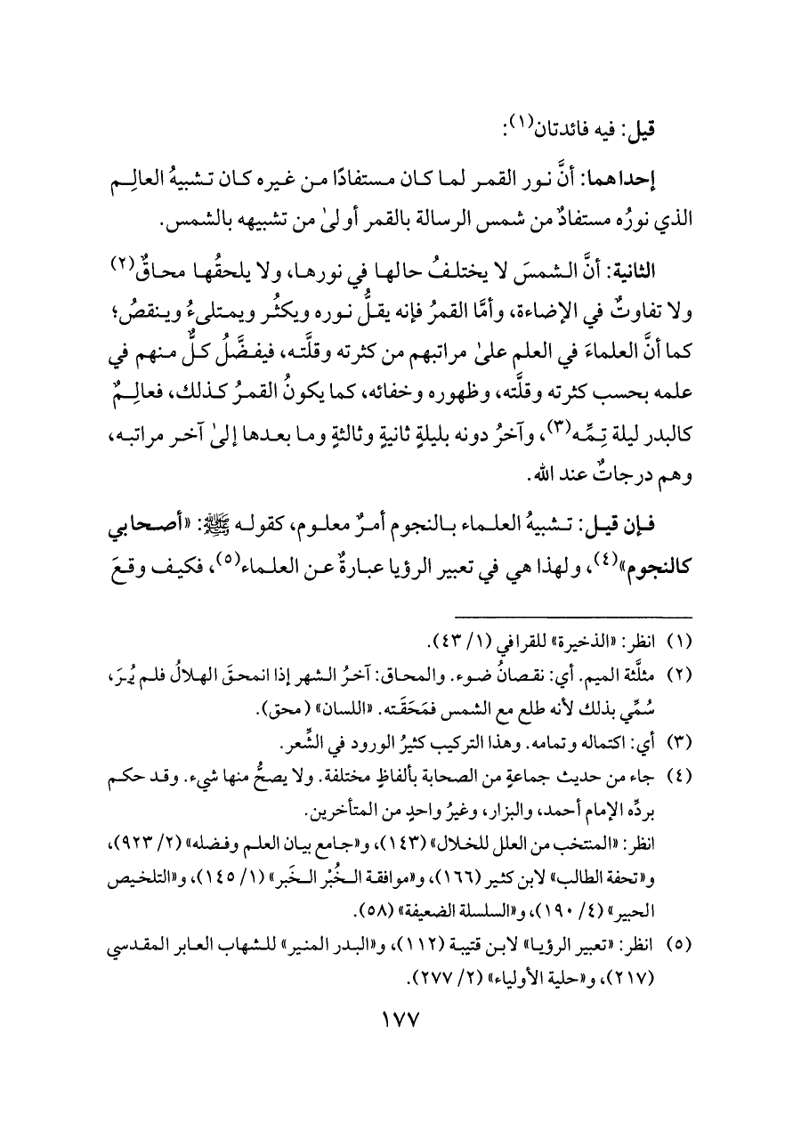 إحداهما: أنَّ نور القمر لما كان مستفادًا من غيره كان تشبيهُ العالِم الذي نورُه مستفادٌ من شمس الرسالة بالقمر أولى من تشبيهه بالشمس.
