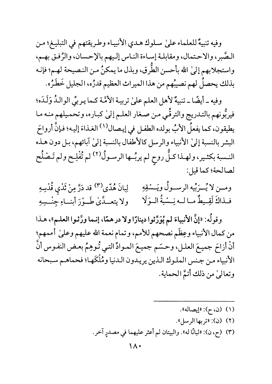 وفيه تنبيهٌ للعلماء على سلوك هدي الأنبياء وطريقتهم في التبليغ؛ من الصَّبر، والاحتمال، ومقابلة إساءة الناس إليهم بالإحسان، والرِّفق بهم، واستجلابهم إلى الله بأحسن الطُّرق، وبذل ما يمكنُ من النصيحة لهم؛ فإنه بذلك يحصلُ لهم نصيبُهم من هذا الميراث العظيم قدرُه، الجليل خَطَرُه.