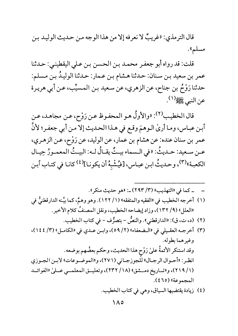 قال الخطيب (¬٢): «والأولُ هو المحفوظ عن رَوْح، عن مجاهد، عن ابن عباس، وما أرى الوهمَ وقع في هذا الحديث إلا من أبي جعفر؛ لأنَّ عمر بن سنان عنده: عن هشام بن عمار، عن الوليد، عن رَوْح، عن الزهري، عن سعيد: حديثُ: «في السماء بيتٌ يقالُ له: البيتُ المعمورُ حِيال الكعبة» (¬٣)، وحديثُ ابن عباس، [فيُشْبِهُ أن يكونا] (¬٤) كانا في كتاب ابن