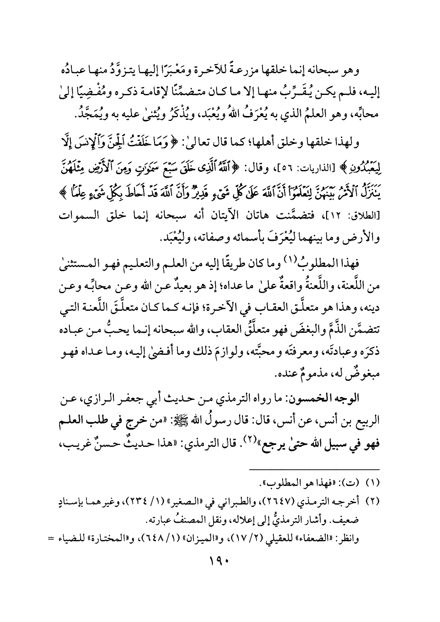 الوجه الخمسون: ما رواه الترمذي من حديث أبي جعفر الرازي، عن الربيع بن أنس، عن أنس، قال: قال رسولُ الله - صلى الله عليه وسلم -: «من خرج في طلب العلم فهو في سبيل الله حتى يرجع» (¬٢). قال الترمذي: «هذا حديثٌ حسنٌ غريب،