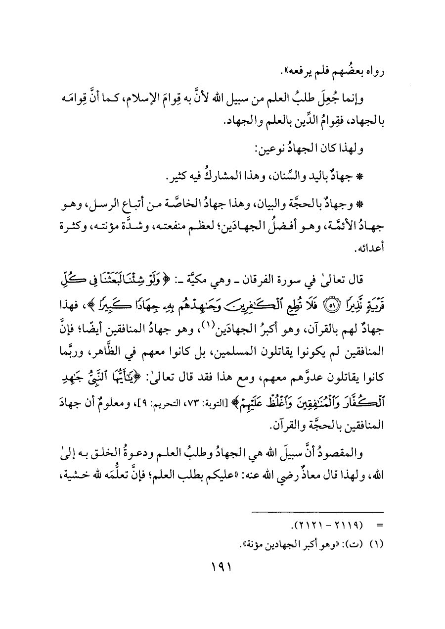 * وجهادٌ بالحجَّة والبيان، وهذا جهادُ الخاصَّة من أتباع الرسل، وهو جهادُ الأئمَّة، وهو أفضلُ الجهادَين؛ لعظم منفعته، وشدَّة مؤنته، وكثرة أعدائه.