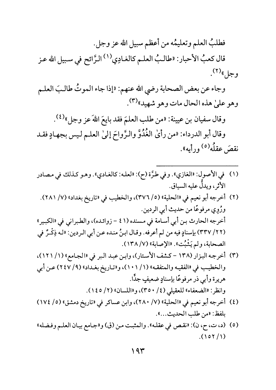قال كعبُ الأحبار: «طالبُ العلم كالغادِي (¬١) الرَّائح في سبيل الله عز وجل» (¬٢).