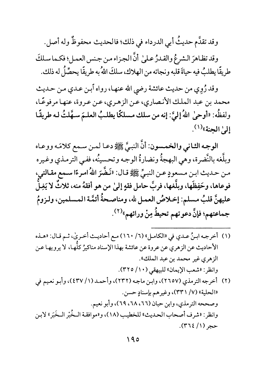 الوجه الثاني والخمسون: أنَّ النبيَّ - صلى الله عليه وسلم - دعا لمن سمع كلامَه ووعاه وبلَّغه بالنَّضرة، وهي البهجةُ ونضارةُ الوجه وتحسينُه، ففي الترمذي وغيره من حديث ابن مسعودٍ عن النبيِّ - صلى الله عليه وسلم - قال: «نَضَّرَ اللهُ امرءًا سمع مقالتي، فوعاها، وحَفِظَها، وبلَّغها، فربَّ حامل فقهٍ إلى من هو أفقهُ منه، ثلاثٌ لا يَغِلُّ عليهنَّ قلبُ مسلم: إخلاصُ العمل لله، ومناصحةُ أئمَّة المسلمين، ولزومُ جماعتهم؛ فإنَّ دعوتهم تحيطُ مِنْ ورائهم» (¬٢).