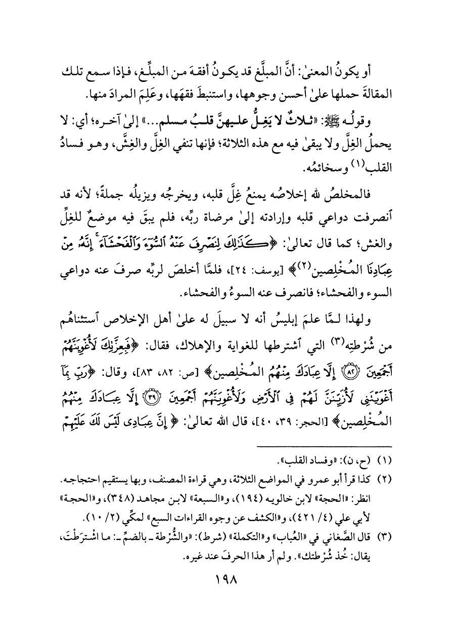 فالمخلصُ لله إخلاصُه يمنعُ غِلَّ قلبه، ويخرجُه ويزيلُه جملةً؛ لأنه قد انصرفت دواعي قلبه وإرادته إلى مرضاة ربِّه، فلم يبقَ فيه موضعٌ للغِلِّ والغش؛ كما قال تعالى: {كَذَلِكَ لِنَصْرِفَ عَنْهُ السُّوءَ وَالْفَحْشَاءَ إِنَّهُ مِنْ عِبَادِنَا المُخْلِصين (¬٢)} [يوسف: ٢٤]، فلمَّا أخلصَ لربِّه صرفَ عنه دواعي السوء والفحشاء؛ فانصرف عنه السوءُ والفحشاء.