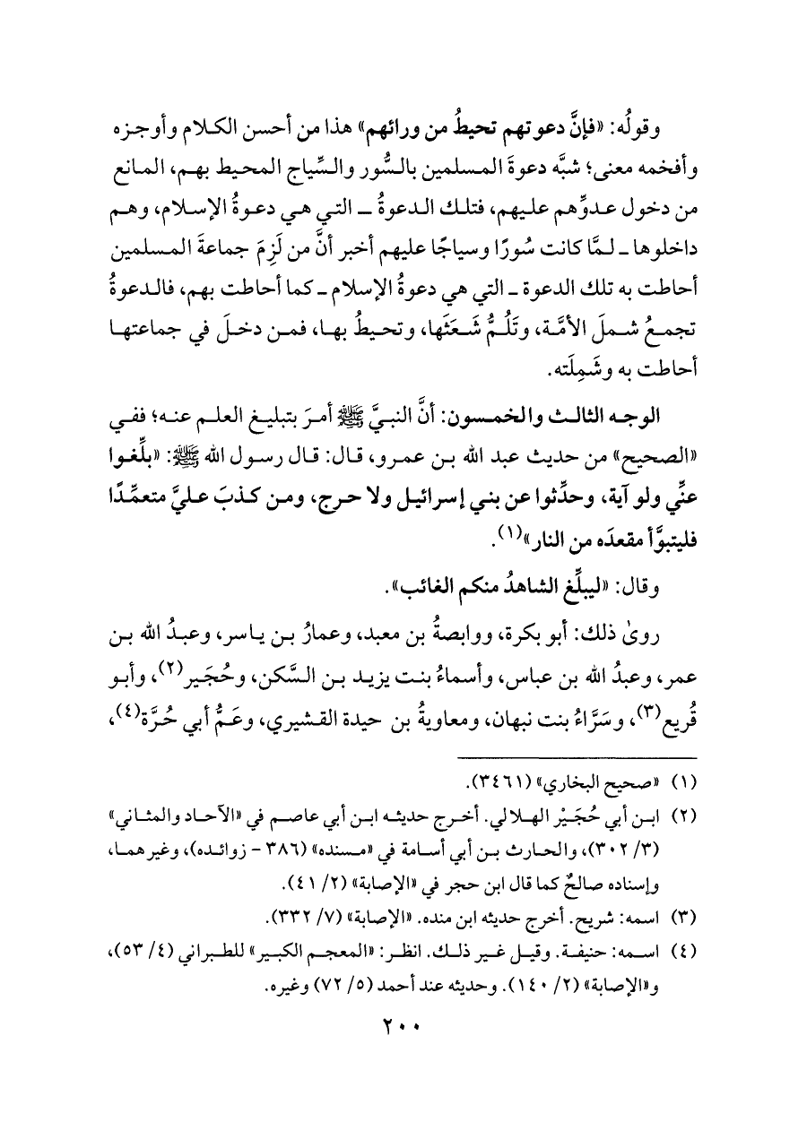 الوجه الثالث والخمسون: أنَّ النبيَّ - صلى الله عليه وسلم - أمرَ بتبليغ العلم عنه؛ ففي «الصحيح» من حديث عبد الله بن عمرو، قال: قال رسول الله - صلى الله عليه وسلم -: «بلِّغوا عنِّي ولو آية، وحدِّثوا عن بني إسرائيل ولا حرج، ومن كذبَ عليَّ متعمِّدًا فليتبوَّأ مقعدَه من النار» (¬١).