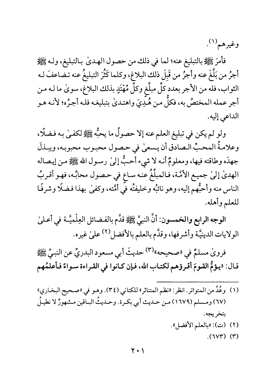 ولو لم يكن في تبليغ العلم عنه إلا حصولُ ما يحبُّه - صلى الله عليه وسلم - لكفى به فضلًا، وعلامةُ المحبِّ الصادق أن يسعى في حصول محبوب محبوبه، ويبذلَ جهدَه وطاقته فيها، ومعلومٌ أنه لا شيء أحبُّ إلى رسول الله - صلى الله عليه وسلم - من إيصاله الهدى إلى جميع الأمَّة، فالمبلِّغُ عنه ساعٍ في حصول محابِّه، فهو أقربُ الناس منه وأحبُّهم إليه، وهو نائبُه وخليفتُه في أمَّته، وكفى بهذا فضلًا وشرفًا للعلم وأهله.