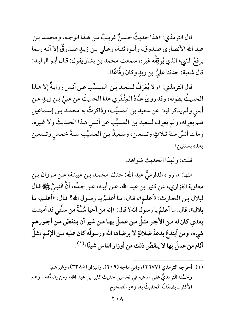 منها: ما رواه الدارميُّ عبد الله: حدثنا محمد بن عيينة، عن مروان بن معاوية الفزاري، عن كثير بن عبد الله، عن أبيه، عن جدِّه، أنَّ النبيَّ - صلى الله عليه وسلم - قال لبلال بن الحارث: «اعلم»، قال: ما أعلمُ يا رسول الله؟ قال: «اعلم، يا بلال»، قال: ما أعلمُ يا رسول الله؟ قال: «إنه من أحيا سُنَّةً من سنَّتي قد أميتت بعدي كان له من الأجر مثلُ من عملَ بها من غير أن ينقصَ من أجورهم شيء، ومن ابتدعَ بدعةَ ضلالةٍ لا يرضاها الله ورسولُه كان عليه من الإثم مثلُ آثام من عملَ بها لا ينقصُ ذلك من أوزار الناس شيئًا» (¬١).