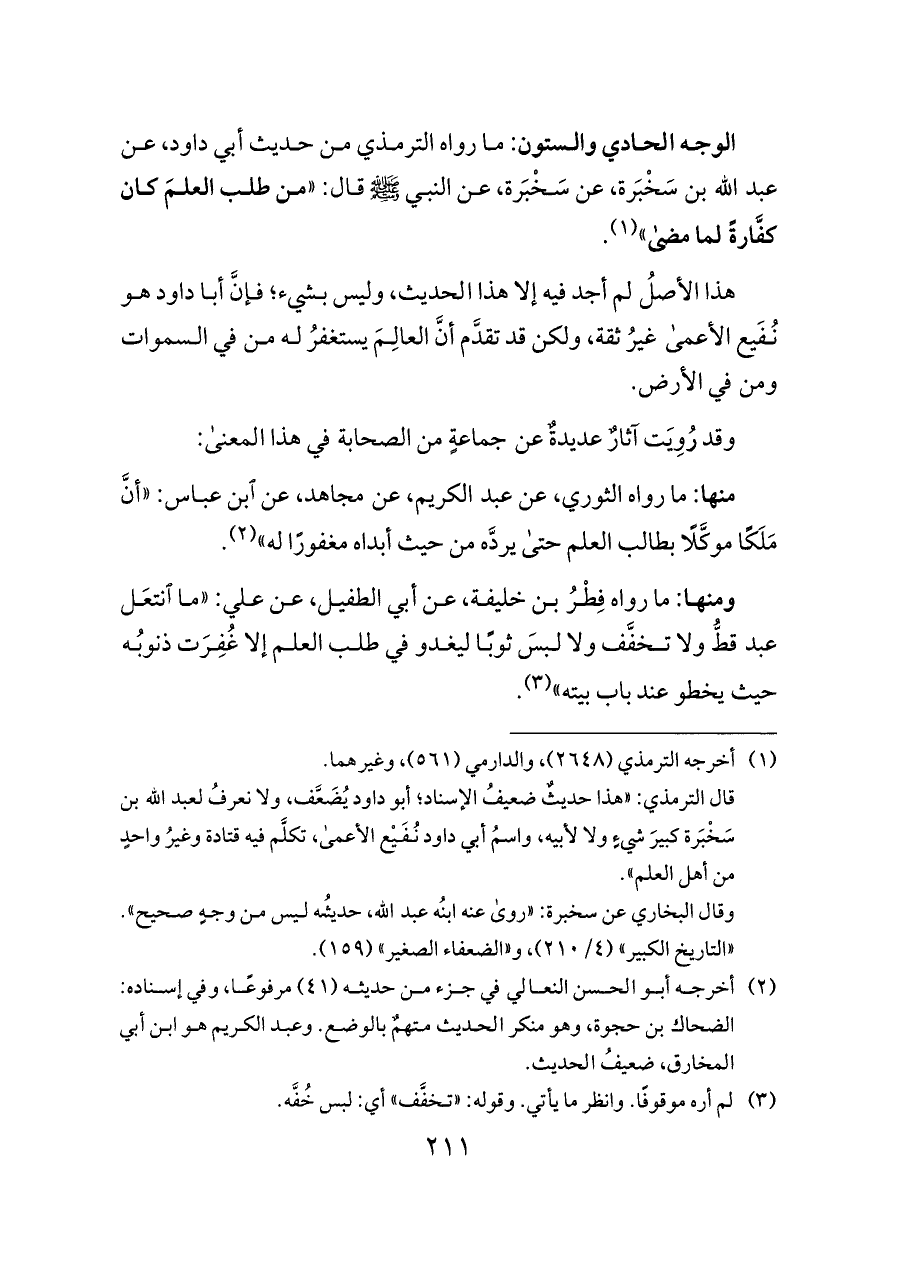 الوجه الحادي والستون: ما رواه الترمذي من حديث أبي داود، عن عبد الله بن سَخْبَرة، عن سَخْبَرة، عن النبي - صلى الله عليه وسلم - قال: «من طلب العلمَ كان كفَّارةً لما مضى» (¬١).