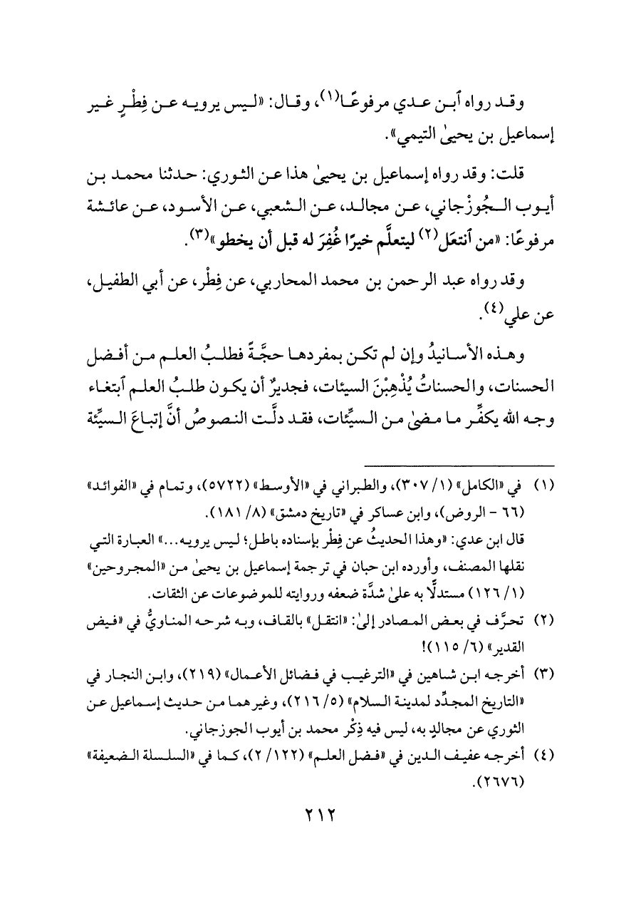 قلت: وقد رواه إسماعيل بن يحيى هذا عن الثوري: حدثنا محمد بن أيوب الجُوزْجاني، عن مجالد، عن الشعبي، عن الأسود، عن عائشة مرفوعًا: «من انتعَل (¬٢) ليتعلَّم خيرًا غُفِرَ له قبل أن يخطو» (¬٣).