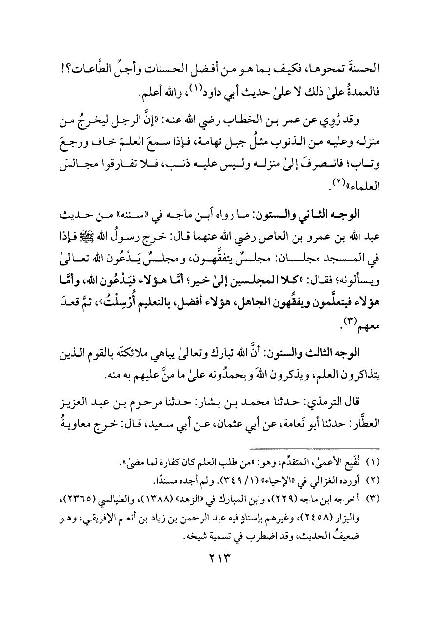 الوجه الثاني والستون: ما رواه ابن ماجه في «سننه» من حديث عبد الله بن عمرو بن العاص رضي الله عنهما قال: خرج رسولُ الله - صلى الله عليه وسلم - فإذا في المسجد مجلسان: مجلسٌ يتفقَّهون، ومجلسٌ يَدْعُون الله تعالى ويسألونه؛ فقال: «كلا المجلسين إلى خير؛ أمَّا هؤلاء فيَدْعُون الله، وأمَّا هؤلاء فيتعلَّمون ويفقِّهون الجاهل، هؤلاء أفضل، بالتعليم أُرْسِلْتُ»، ثمَّ قعدَ معهم (¬٣).